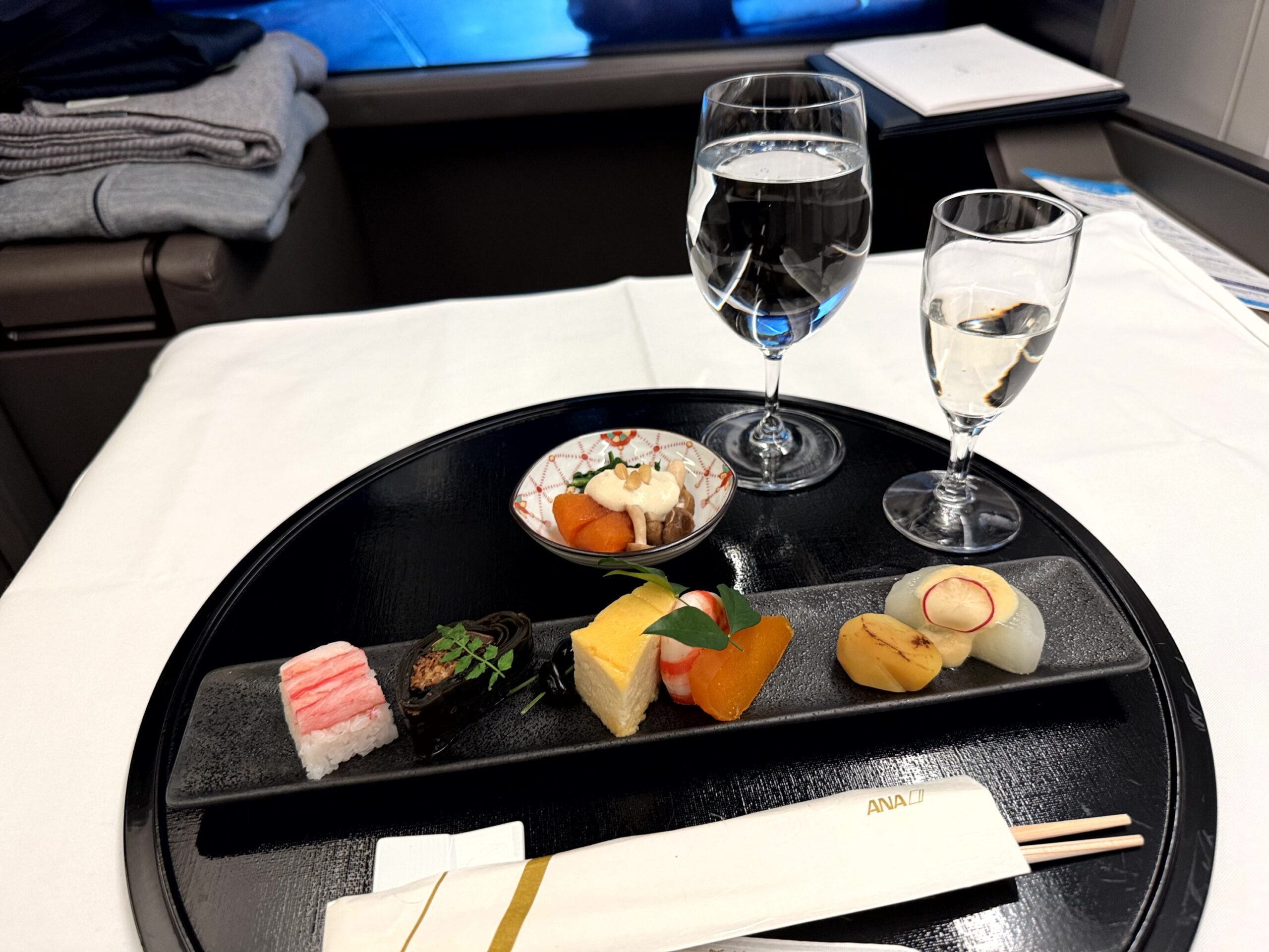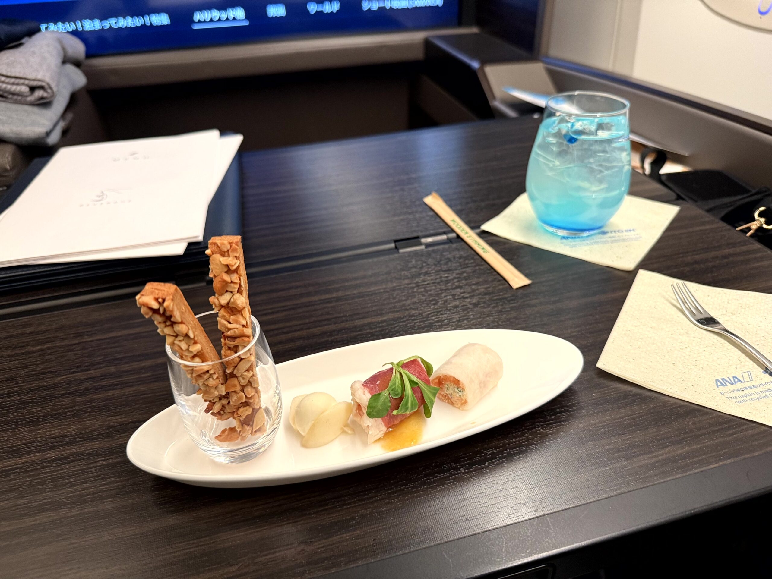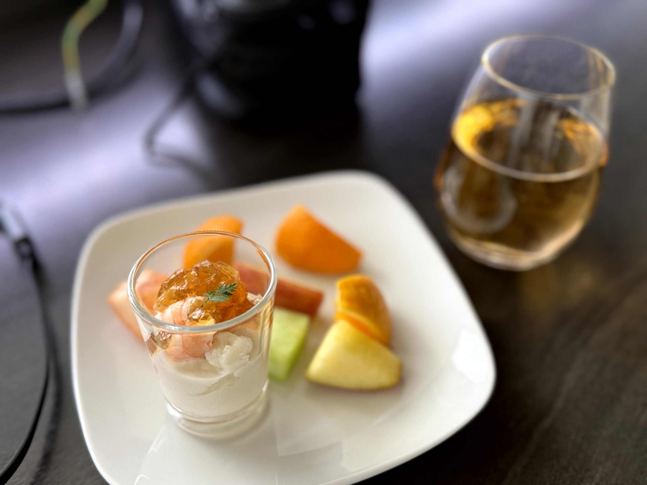 初めて食べるファーストクラス機内食。使い捨て容器ではなくちゃんとしたお皿で出る味・見た目共に美しいお食事を空の上で食べる贅沢。僕なんかが、こんなサービスを受けて良いのだろうか?と何度も思ってしまうほど素敵なお食事を楽しむことができました。