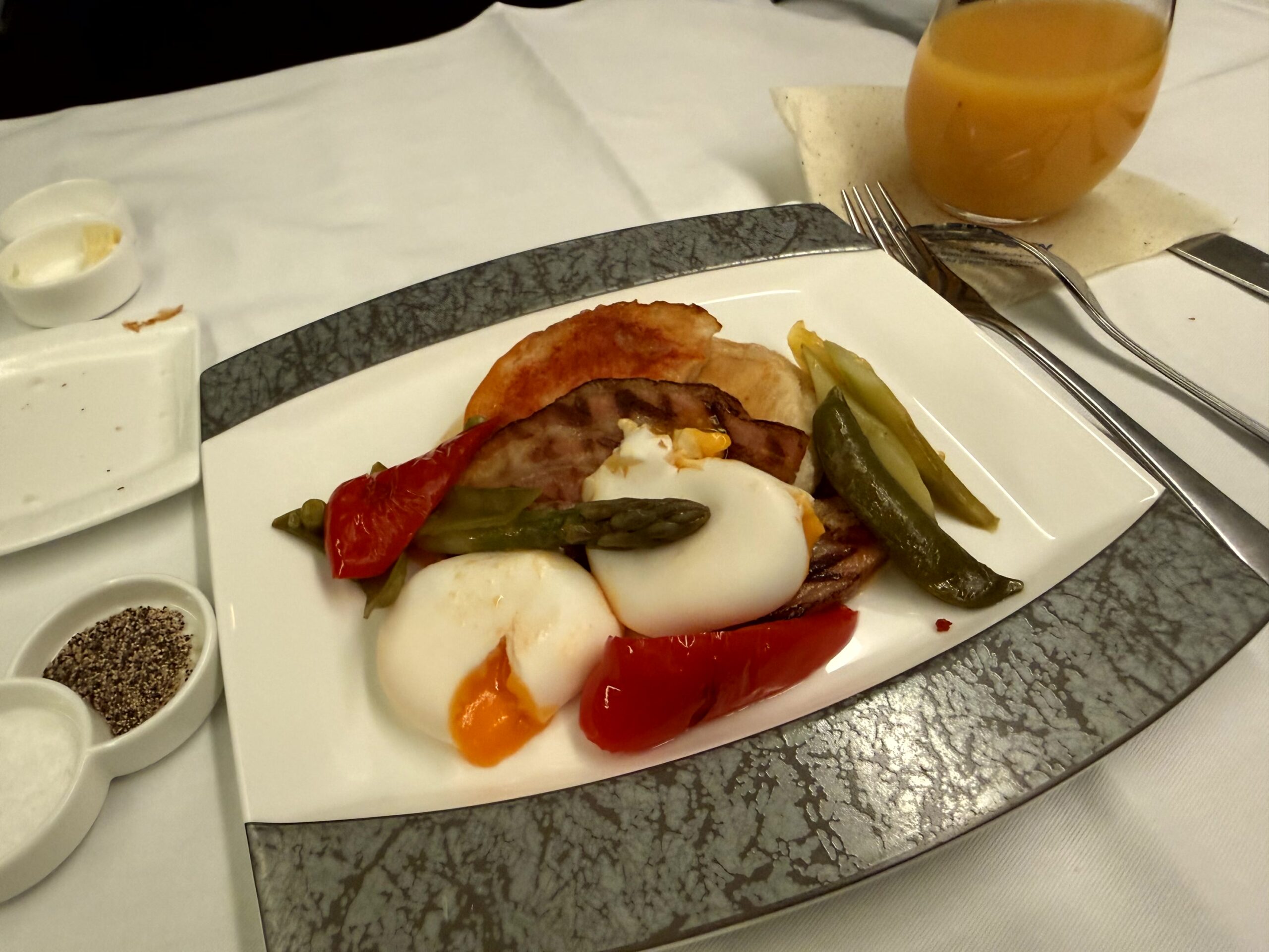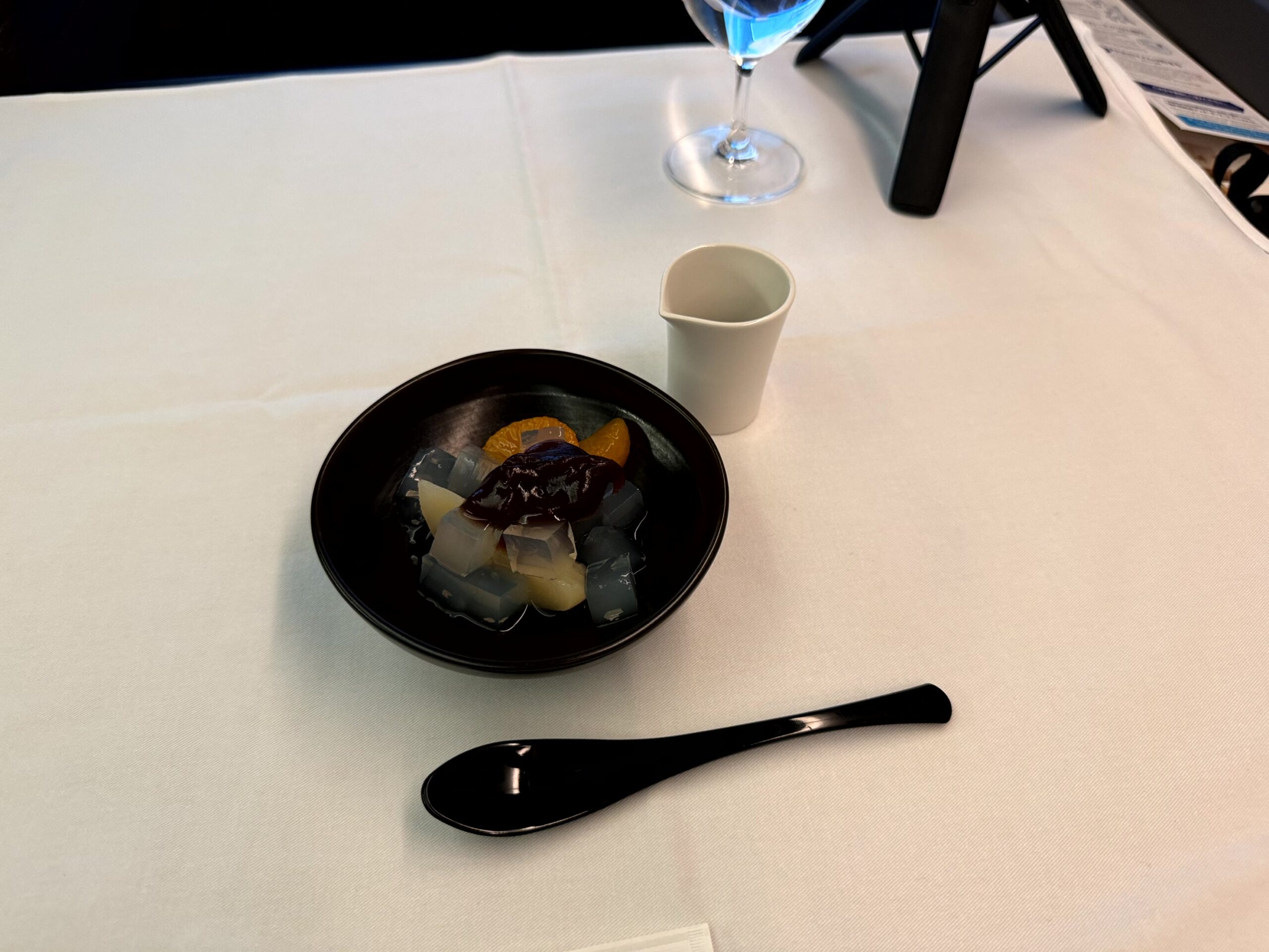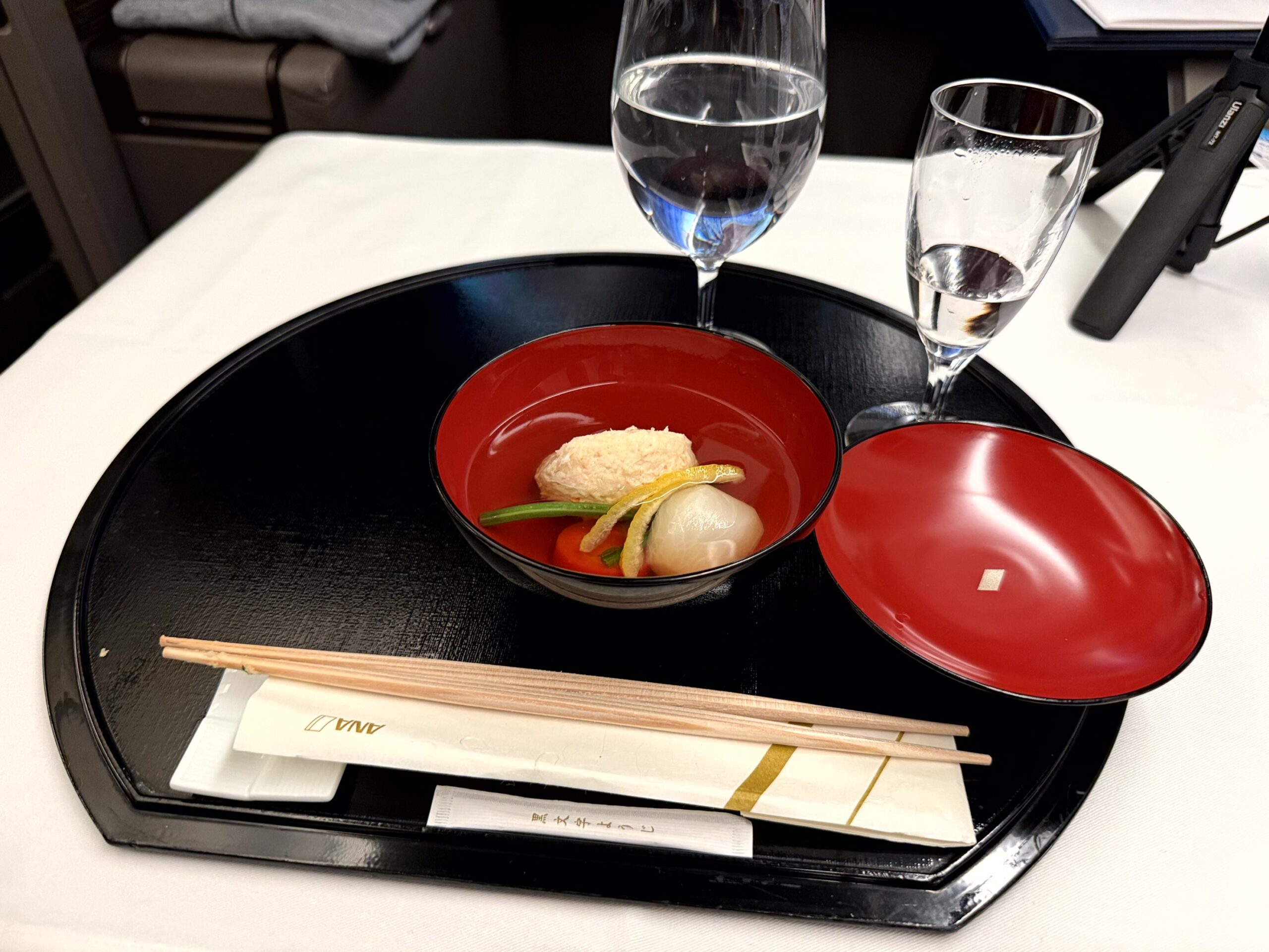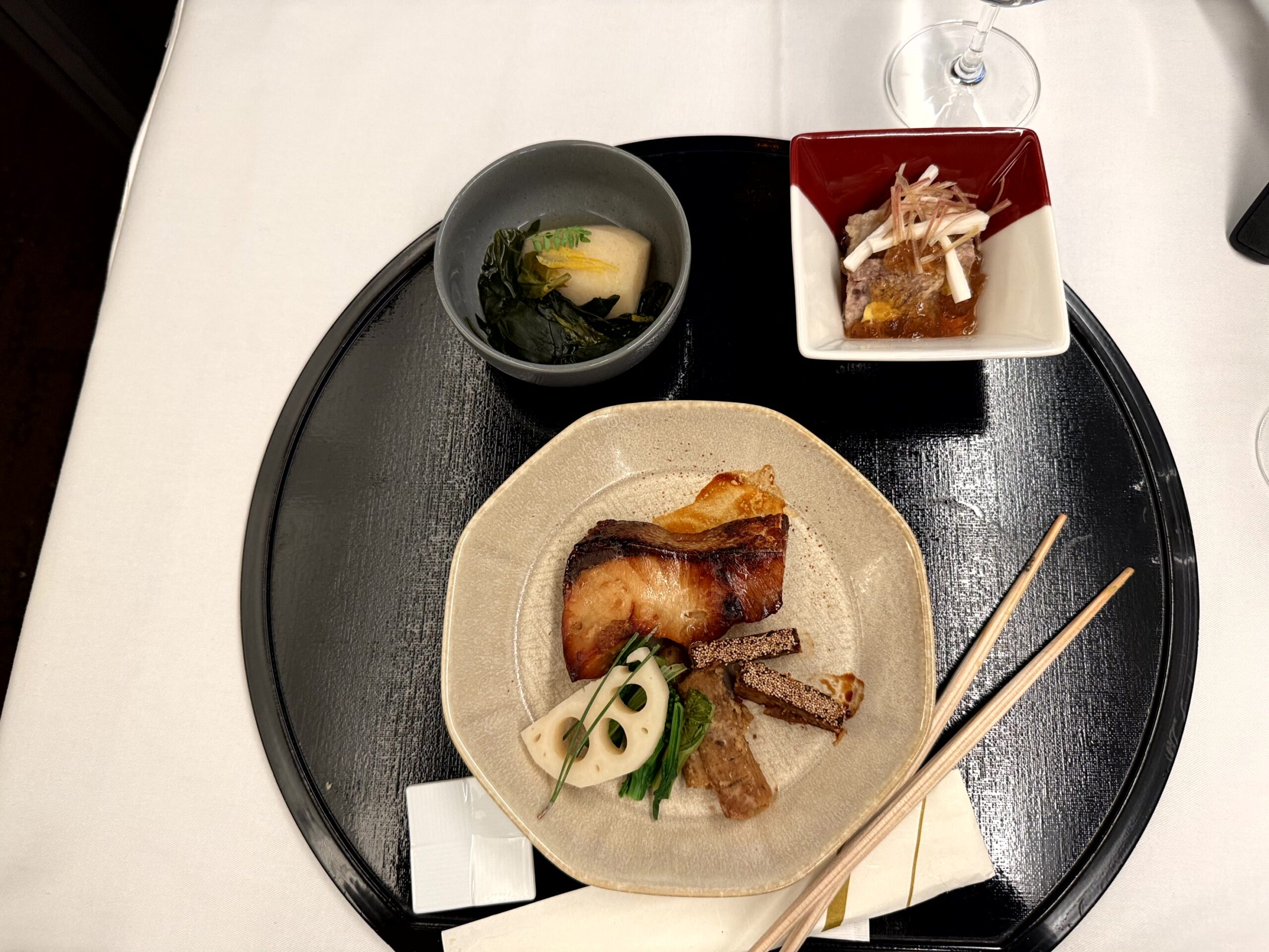 初めて食べるファーストクラス機内食。使い捨て容器ではなくちゃんとしたお皿で出る味・見た目共に美しいお食事を空の上で食べる贅沢。僕なんかが、こんなサービスを受けて良いのだろうか?と何度も思ってしまうほど素敵なお食事を楽しむことができました。