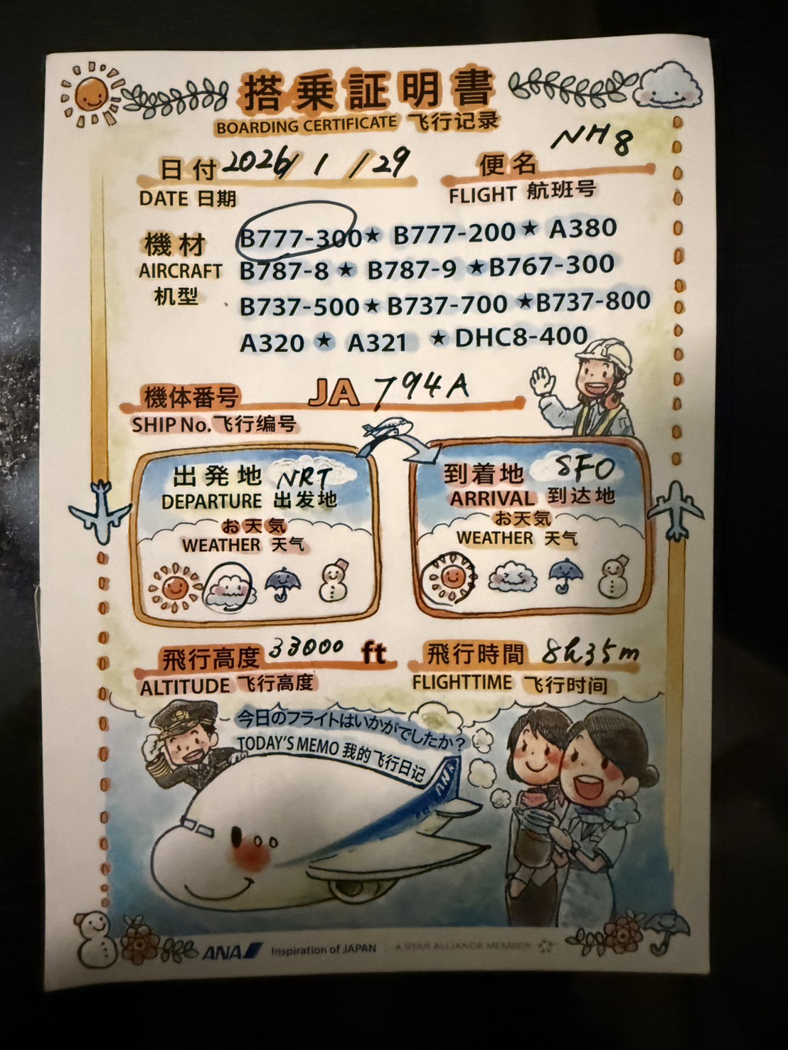 フライトの最後には搭乗証明と手書きのメッセージをいただきました。